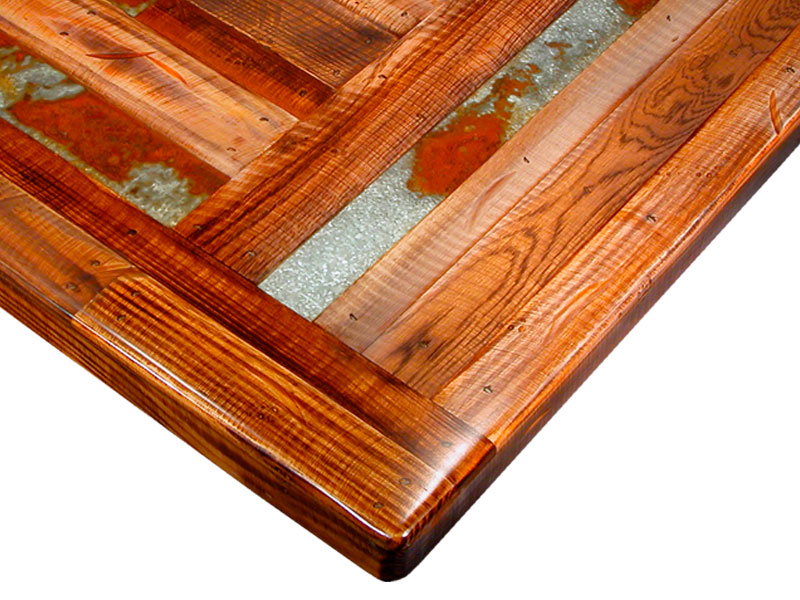 A stained, multi-species barn board veneer dining table with faux acid-washed metal inlays is a bold and sophisticated choice for restaurant interiors. This table design merges rustic charm with industrial edge, creating a striking centerpiece that enhances the dining experience.