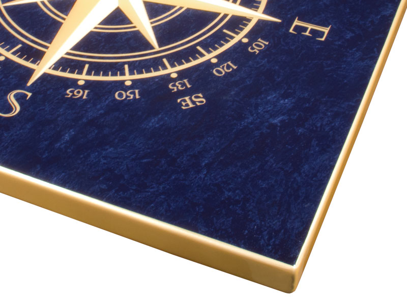 Framing the entire design is a brass-style border, digitally rendered to appear polished yet slightly antiqued, as though shaped by years of maritime history. Its circular form enhances the table’s symmetry while emphasizing the compass rose at its center. The frame’s detailed contours and reflective highlights add a realistic metallic presence that complements the central motif.